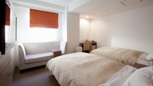 ・デラックスツインルーム はシモンズ製セミダブルベッド2台にソファ付、